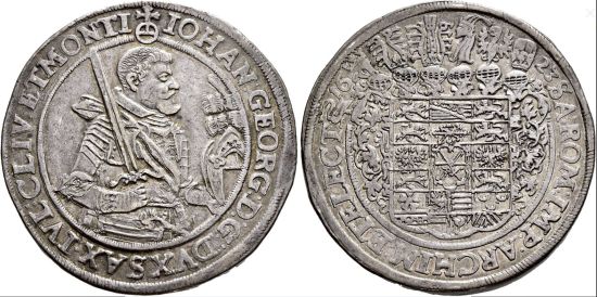 This specimen was lot 2621 in Sincona sale 83 (Zürich, May 2023), where it sold for 1,950 CHF (about US$2,610 including buyer's fees). The catalog description[1] noted, "Sachsen, Herzogtum, ab 1547 Kurfürstentum, Johann Georg I. 1615-1656. 2 Taler 1623, Dresden. Sehr selten. Sehr schön (Very rare, Very fine)." We can't see the difference between Dav-7590A (listed for 1616-19) and Dav-7600 (listed for 1620-38). The SCWC states this date should have mintmaster's initials HR; instead we see a swan mintmark.
