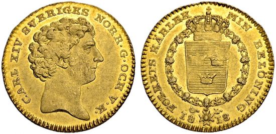 "SCHWEDEN, Karl XIV. Johann, 1818-1844. Dukat 1818, Stockholm. Vorzüglich. Leicht justiert. Übliche Prägeschwäche. (kingdom of Sweden, Charles XIV John, 1818-44, ducat of 1818, Stockhom mint. Extremely fine, Minor adjustment marks, With the usual weak strike.)"