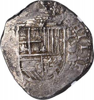 This specimen was lot 7291 in Stack's Bowers NYINC sale (New York, January 2017), where it sold for $493.50. The catalog description[1] noted, "SPAIN. 8 Reales, 1593/2-B. Seville Mint. Philip II (1556-98). NGC EF-40. Bold 4 digit date. Full shield and cross. Toned and attractive." This type is from Seville and was struck 1589-96. All these early Spanish pesos are rare. It is hammered.