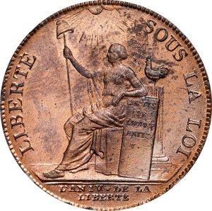 This specimen was lot 23447 in Stack's Bowers NYINC sale (Newport Beach, CA, January 2021), where it sold for $144. The catalog description[1] noted, "FRANCE. Bronze 2 Sols, 1792. NGC MS-64 Red Brown. Token coinage with a depiction of Seated Liberty. A boldly struck and highly lustrous coin with nearly complete mint red."