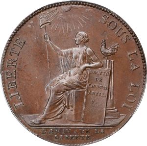 "FRANCE. Constitution. Bronze 2 Sols Token Essai (Pattern), Year IV/1792. Birmingham (Soho) Mint. PCGS SPECIMEN-65. Maz-157/9 (C). Variety with (PATENTÉ). Lettered edge. By M. Boulton & N.-A. Ponthon for the Monneron Brothers. An exceptional example, this specimen striking exhibits a sharp strike, rich brown surfaces, and enchanting eye appeal radiating throughout. Mazard is somewhat confusing, as Maz-157 and Maz-159 would appear to point to the same type. From the Richard Margolis Collection (acquired from Phil Keller on 22 March 1995)."