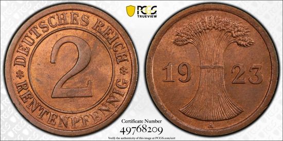 This specimen was lot 2617 in Steve Album Auction 52 (Santa Rosa, CA, May 2025), where it sold for $42. The catalog description[1] noted, "GERMANY: Weimar Republic, AE 2 rentenpfennig, Berlin, 1923-A, a superb lustrous mint state example! PCGS graded MS65 RB." The rentenmark and its subdivision the rentenpfennig were used 1923-24. Many issues minted during that time are today rare altho this type is common. It was superseded by a two reichspfennig struck 1924-25 and 1936 (KM 38).