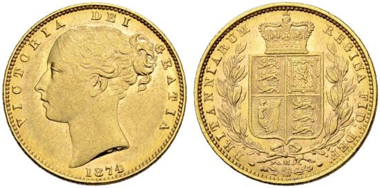 "Victoria, 1837-1901. Sovereign 1874, Melbourne. Vorzüglich-FDC. Überdurchschnittliche Erhaltung. (Australia, Victoria, 1837-1901, sovereign of 1874, Melbourne mint. Extremely fine-uncirculated, Extraordinary condition.)"