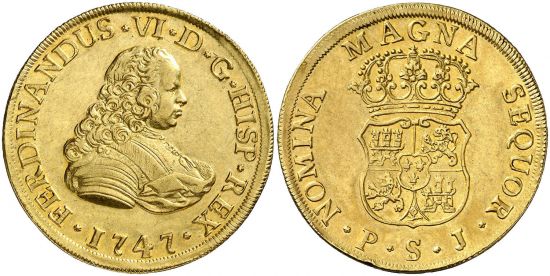 "1747. Fernando VI. Sevilla. PJ. 4 escudos. Mínimo golpecito en canto del reverso. Bella. Brillo original. Ex Colección Caballero de las Yndias, nº 2074. Muy rara y más así. EBC. (1747 4 escudos of Ferdinand VI, Seville mint. Minor rim nick on the reverse. Handsome, original luster, very rare thus, extremely fine.)"