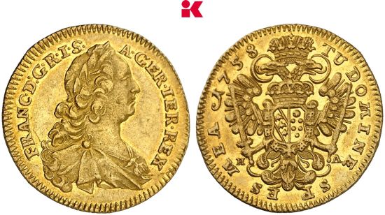 "HABSBURGISCHE ERBLANDE-ÖSTERREICH · RÖMISCH-DEUTSCHES REICH, Franz I., 1745-1765. Dukat 1758 H-A, Hall. Brustbild r. mit Lorbeerkranz, umgelegtem Mantel und der Kette des Ordens vom Goldenen Vlies//Gekrönter Doppeladler mit Kopfscheinen und Schwert und Zepter in den Fängen, auf der Brust gekröntes, zweifeldiges Wappen (Lothringen-Toskana), zu den Seiten die geteilte Münzstättensignatur H - A. GOLD. Sehr seltener Jahrgang. Vorzüglich/vorzüglich-Stempelglanz. Exemplar der Auktion Adolph Hess 256, Luzern 1986, Nr. 757. (Holy Roman Empire, Francis I, 1745-65, ducat of 1758, Hall mint. Obverse: armored, mantled and laureate bust with Order chain; reverse: crowned and nimbate double-headed eagle with sword and scepter in its claws, supporting the impaled arms of Lorraine and Tuscany, mintmark below. Very rare date, extremely fine to uncirculated.)