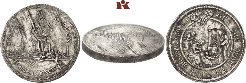 "DEUTSCHE MÜNZEN UND MEDAILLEN · MÜNSTER, BISTUM Ferdinand von Bayern, 1612-1650. Doppelter Schautaler 1638, Münster. Die Geburt Jesu, oben Engel in strahlenden Wolken//Stadtansicht, darüber Kniebild des Heiligen Paulus mit Schwert und Buch, unten die Signatur EK (Engelbert Ketteler, Münzmeister in Münster 1636-1661) und die Jahreszahl 1638. Von größter Seltenheit. Hübsche Patina, kl. Randfehler, sehr schön-vorzüglich. Exemplar der Auktion Fritz Rudolf Künker 17, Osnabrück 1990, Nr. 2491 und der Auktion Fritz Rudolf Künker 305, Osnabrück 2018, Nr. 3938. (Germany, bishopric of Münster, Ferdinand of Bavaria, 1612-50, double show thaler of 1638, Münster mint. Obverse: the birth of Jesus; reverse: city view with St. Paul in a cloud with sword and book, date below. Extremely rare, handsome patina, small edge defects, very fine to extremely fine.)"