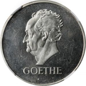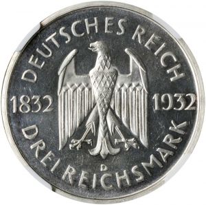This specimen was lot 44511 in Stack's Bowers ANA sale (Costa Mesa, CA, August 2021), where it sold for $240. The catalog description[1] noted, "GERMANY. 3 Mark, 1932-D. Munich Mint. NGC PROOF-63 Cameo. Bust of Johann Goethe left. A Proof with reflective fields, frosty devices, and a few light scuffs on the obverse." This type was issued at six mints along with a five mark (Dav-974) and is fairly common. It is the last Weimar commemorative.