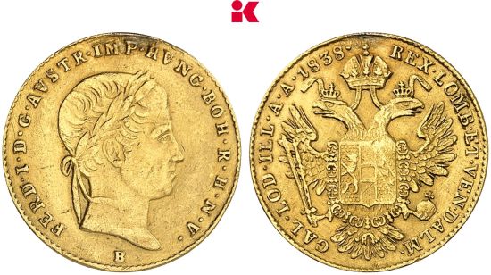 This type was struck 1837-48 in substantial numbers from Vienna (Fr-481), Kremnitz (shown here), Karlsburg (Fr-226) and Venice (Fr-1504). Some authorities list this issue under Hungary but it differs only in mintmark from the Vienna product.