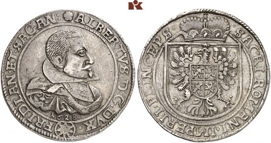 Wallenstein was born into the minor Protestant nobility of Bohemia but converted to Catholicism while attending university in Italy. Seeking glory, he pursued a military career and eventually became the commander of the imperial troops during the Thirty Years War. His successes against the Protestants aroused the suspicion of the emperor and he was dismissed in 1630. He retired to his duchy of Friedland in northern Bohemia. Imperial defeats at the hands of Gustavus Adolphus forced the emperor to recall him but distrust of his loyalty remained. He was assassinated by his officers with the emperor's connivance in 1634. He issued thalers 1626-33, all rare. After Wallenstein's death, the duchy subsided into insignificance and no more coins were issued.