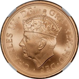 This specimen was lot 32606 in Heritage Sale 3115 (Chicago, May 2024), where it sold for $4,440. The catalog description[1] noted, "Great Britain: Charles III gold Matte "King Charles III Coronation" 5 Pounds 2023 MS70 NGC. First Releases. Commemorating the coronation of King Charles III. Carrying flawless matte finish and bestowed with perfect technical grade."
