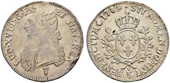 This specimen is an écu au buste habillé struck at the Bordeaux mint, one of a type struck there 1775-91. Its divisions were the ½, 1/5, 1/10 and 1/20 écu, struck in modest quantities. The écu was worth $1.10 in the USA before the Civil War. The écu au buste habillé is the most popular coin of Louis XVI among collectors. The 1789-K is priced[1] about 2½ times the most common date (1789-A) but it is not rare.