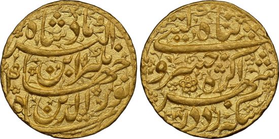 "MUGHAL: Jahangir, 1605-1628, AV sawai mohur (heavy mohur), Agra, AH1018 year 4, with Khusru couplet, Persian inscription nur al-din shah jahangir ibn akbar badshah, regnal date to left // sikka zad dar shahr-e agra khusru-e giti panah, hijri date to lower left, much luster on both sides, an absolutely lovely design with excellent eye appeal, NGC graded MS61, RRR. A consummate lover of fine arts, Jahangir was known from his diary to dictate the designs and specifications of novel coinage (see the English translation by Rogers & Beveridge, London, 1909). Among them was the Nur-Jahani mohur, which weighed 20% more than the standard mohur and was ordered to replace the latter (p.11). In a later entry, he further alludes to the striking of mohurs with one and a quarter times the weight, or "sawa'i" in Persian, before finally returning to the original weight standard (p.197 & errata p.450). This distinct type, which was 25% heavier, thus came to be known as the sawai mohur. As with most types of gold among Jahangir's dazzling and prolific output, the sawai mohur was struck in limited quantities solely as a presentation issue for court officials and foreign dignitaries."