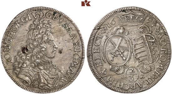 "SACHSEN, KURFÜRSTENTUM, Johann Georg IV. 1691-1694. 2/3 Taler 1694, Dresden. Hübsche Patina, leicht justiert, vorzüglich. (electorate of Saxony, John George IV, 1691-94, two-thirds thaler of 1694, Dresden mint. Handsome patina, lightly adjusted, extremely fine.)"