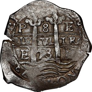This specimen was lot 51137 in Stack's Bowers ANA sale (Pittsburgh, PA, August 2023), where it sold for $1,560. The catalog description[1] noted, "BOLIVIA. Cob 8 Reales, 1673-P E. Potosi Mint. Charles II. NGC MS-62. Not surprisingly the finest of the date seen in the NGC population report (and the only such Mint State specimen by far), this nearly-Choice crown presents the typical crude method of manufacture by which the series is known, but nevertheless stands without any evidence of handling. The dual dates are quite clear, as are many of the other details and design elements." Royals are known of this type from the Potosi mint but all are rare. The regular cob issues are not nearly as nice. The years 1649-52 were a period of reform at the Potosi mint; it was found that the previous mintmasters in office 1625-48 had been debasing the cobs, a crime for which one official paid with his life. Assayer E is noted for 1650-79.