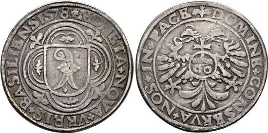 "SCHWEIZ Basel, Stadt und Kanton, Guldentaler 1578, Basel. Sehr schön. (Switzerland, canton of Basel, guldenthaler of 1578, Basel mint. Very Fine.)"