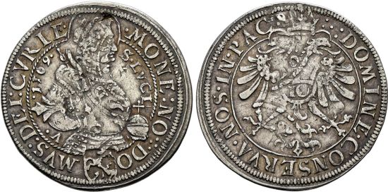 "SCHWEIZ Graubünden, 10 Kreuzer 1569, Chur. Brustbild des hl. Luzius im Harnisch nach rechts mit Krone und Nimbus, das geschulterte Zepter in der Rechten, in der Linken den Reichsapfel. MONE NO DO [kl. Wappen mit Steinbock n. links] MVS DEI CVRIE. Im Feld S LVCI V 1569. Rv. Nimbierter Doppeladler mit Reichsapfel und Wertangabe auf der Brust. DOMINE CONSERVA NOS IN PACE. Durchmesser 29.41 / 29.08 mm. Gleichständige Stempelstellung. Von grösster Seltenheit. Sehr schön. Beidseitig Überprägungsspuren. Kleiner Einhieb bei 12 Uhr im Avers. (Switzerland, city of Chur, ten kreuzer of 1569, Chur mint. Obverse: armored bust of St. Lucius right with crown, halo, scepter and orb, "S. LVCI" in the field; reverse: nimbate double headed eagle with orb and value on its breast. Of the highest rarity, Very Fine, Traces of overstrike on both sides. Small nick at 12 o'clock on obverse.)