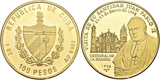 "CUBA | Republik. 200 Pesos 1998. Besuch des Papstes in Kuba. FDC aus Polierter Platte. Leicht berieben und berührt. (Cuba, 200 pesos (sic) of 1998, Papal visit to Cuba. Uncirculated from Proof, lightly polished and minor touch marks.)"