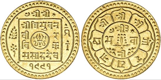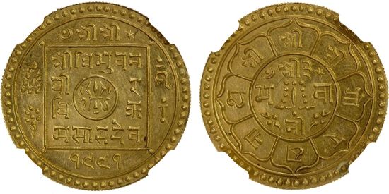 The first specimen was lot 1105 in Stephen Album sale 43 (Santa Rosa, CA, May 2022), where it sold for $840. The catalog description[1] noted, "NEPAL: Tribhuvana Vira Vikrama, 1911-1950, AV mohar, VS1991 (1934), NGC graded MS63." This type was struck VS 1969, 1975, 1978-1991, 1998-2005. No date is given a premium, more likely due to lack of interest than any variation in rarity. Nepal was and is an independent nation between India and Tibet but under the strong influence of the British raj. Mohars also exist in silver. The second specimen was lot 3289 in Sincona sale 83 (Zurich, May 2023), where it sold for 1,400 CHF (about US$1,874 including buyer's fees). The catalog description[2] noted, "NEPAL, Tribhuvana, Bir Bikram, 1968-2007 VS (1911-1950 AD). Mohar 1991 VS (1934 AD), NGC MS65. Prachtvolle Erhaltung (Magnificent condition)."