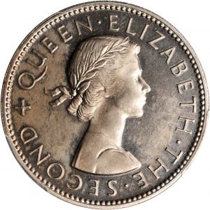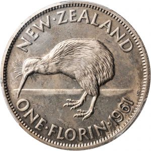 This specimen was lot 1323 in Stack's Bowers ANA auction (Chicago, August 2014), where it sold for $1,410. The catalog description[1] noted, "NEW ZEALAND. Florin, 1961. PCGS PROOF-64 CAMEO Secure Holder. Very light rose toning. From the Kevin Tierney Collection." New Zealand received her distinctive coinage starting in 1933. Early florins were 0.500 fine silver but were converted to copper-nickel in 1947. The 1953 issue introduced the bust of queen Elizabeth while the type shown here was produced 1961-65 with a modified bust. Circulation issues are common in all grades, the proofs are rare.