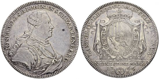 "DEUTSCHLAND | Schwarzenberg, Fürstentum, Josef Adam, 1732-1782. Taler 1766, Nürnberg. Sehr schön-vorzüglich. Feine Patina. (Germany, principality of Schwarzenberg, Joseph Adam, 1732-82, thaler of 1766, Nuremberg mint. Very fine-extremely fine, Nicely toned.)"