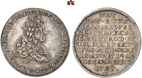 − | This specimen was lot 5707 in Künker sale 354 ( | + | This specimen was lot 5707 in Künker sale 354 (Osnabrück, Germany, September 2021), where it sold for €300 (about US$418 including buyer's fees). The catalog description<sup>[1]</sup> noted, <blockquote>"''BRAUNSCHWEIG UND LÜNEBURG, BRAUNSCHWEIG-LÜNEBURG, FÜRSTENTUM, - als Georg I. König von Großbritannien, 1714-1727. 1/8 Reichstaler 1727, Clausthal, auf seinen Tod in Osnabrück am 12. Juni. Hübsche Patina, vorzüglich. Aus der Sammlung eines Ingenieurs. Exemplar der Slg. Dr. Werner Koch, Teil 1, Auktion Dr. Busso Peus Nachf. 273, Frankfurt/Main 1970, Nr. 943 - erworben 1971 von Dr. Waldemar Wruck, Berlin. Am 3. Juni 1727 trat Georg eine Reise von London nach Hannover an. Er erreichte Delden am 9. Juni. Am nächsten Morgen wollte er weiter nach Osnabrück, in der Gegend von Ibbenbüren erlitt er jedoch einen Schlaganfall und starb am 12. Juni im Schloß Osnabrück.'' ([[Germany]], [[German States, Brunswick-Luneburg|duchy of Brunswick-Luneburg-Calenberg-Hannover]], as George I, king of Great Britain, 1714-27, one eighth thaler of 1727, Clausthal mint, on his death at Osnabrück on July 12. Handsome patina, extremely fine. On June 3, 1727, George embarked on trip from London to Hannover. He reached Delden on June 12th. The next morning he intended to continue to Osnabrück, but in the Ibbenbüren area he suffered a stroke and died on June 12th in Osnabrück Castle.)"</blockquote> George I's death was marked by the issue of an eighth thaler (shown here), quarter thaler ([[Hannover 1727-CPS 1/4 thaler|KM 181]]), half thaler ([[Hannover 1727-CPS 1/2 thaler|KM 183]]) and thaler ([[Hannover 1727-CPS thaler Dav-2082|Dav-2082]]). |