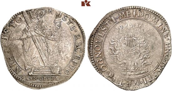 "Carlo I. 1627-1637. Scudo o. J. (1630), geprägt während der Belagerung im Mantuanischen Erbfolgekrieg, 1629-1630. NIHIL · ISTO - T - R - ISTE · RECEPTO St. Andreas mit Kreuz steht v. v. im Abschnitt · MAN · OBSES ·//(Hostiengefäß) DOMINE · PROBASTI · ME · TE(verschlungen) · COGNOVISTI · ME Schmelztiegel mit Silberzainen in loderndem Feuer. RR Unregelmäßiger Schrötling, sehr schön. Aus der Sammlung Eberhard Link. Exemplar der Auktion Auctiones 17, Basel 1988, Nr. 1294. (Italy, duchy of Mantua, Charles I, 1627-37, undated scudo, struck during the siege of the War of the Mantuan Succession, 1629-30. Obverse: St. Andrew with his cross; reverse: crowned arms in flames. Very rare, irregular edge, very fine.)"