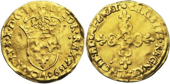 This coin is called the écu d'or au soleil in Duplessy[2] with a face value of fifty sols tournois. Charles X was actually the pretender put up by the Catholic League in opposition to Henry IV, who had converted from Protestantism. This Cardinal never ruled France as he was a prisoner of Henry IV.