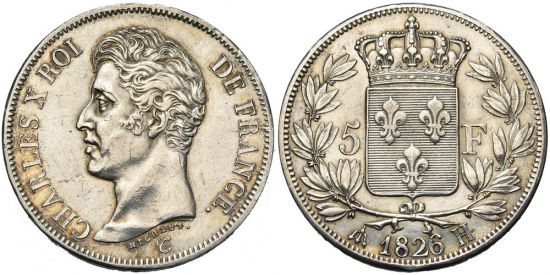 "FRANCE, Charles X (1824-1830), AR 5 francs, 1826H, La Rochelle. Nettoyé. Très Beau à Superbe. (kingdom of France, Charles X, 1824-30, silver five francs of 1826, La Rochelle mint. Cleaned, Very Fine - Extremely Fine.)"