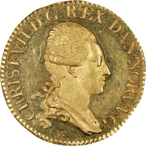 This coin marks the beginning of the Christian and Frederik d'or coinage which continued up until decimalization in 1873. The coins were intended for and mainly used in international transactions, and all are coveted by collectors in Denmark and abroad."