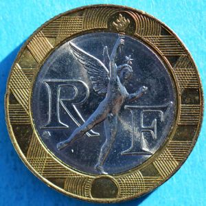 The specimen shown is an example of a type struck in France 1988-2001. The figure depicted is from a commemorative column in the Place de la Bastille in Paris. This type was extensively counterfeited despite the bimetallic fabric. France began minting euros in 1999.
