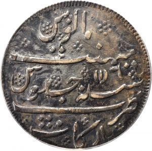 − | From the Alexander Christopher Collection. Ex Fred Pridmore Collection (Part II, Glendining, 18 October 1982), lot 410."</blockquote> This issue is not listed in the 18th century SCWC but | + | From the Alexander Christopher Collection. Ex Fred Pridmore Collection (Part II, Glendining, 18 October 1982), lot 410."</blockquote> This issue is not listed in the 18th century SCWC but in the 19th century SCWC. Altho dated in the eighteenth century, it was almost certainly made in the nineteenth century by the English on behalf of the (long dead) Mughal emperor. It was struck with frozen dates. Two dates are noted, KM 404.1 (AH 1172/2) and KM 404.2 (AH 1172/6). The English also made eighth rupees ([[Madras AH 1172(6) 1/8 rupee KM-408|KM 408]]), quarter rupees ([[Madras AH 1172(6) 1/4 rupee KM-400|KM 400]], [[Madras AH 1172(6) 1/4 rupee KM-409|409]], 413, 425, 434), half rupees ([[Madras AH 1172(6) 1/2 rupee KM-401|KM 401]], 402, [[Madras AH 1172(6) 1/2 rupee KM-414|414]], 426, 435) and rupees ([[Madras AH 1172(6) rupee KM-403|KM 403]], 410, 415.2, 415.1, 427, 436), all much more common than this double rupee. Some were probably milled. |