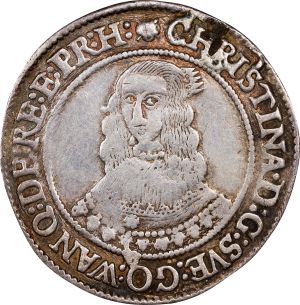 This specimen was lot 58494 in Stack's Bowers NYINC sale (New York, January 2024), where it sold for $264. The catalog description[1] noted, "SWEDEN. 1/4 Riksdaler, 1646. Stockholm Mint. Christina. VERY FINE Details, Plugged. From an Old Brooklyn Collection." This type was struck 1641-46. Some of the 1646 strikes have mintmaster's initials AG and others have the date in Roman numerals. This example, which has neither, is priced as a type coin but is still scarce. The full riksdaler is more often seen.