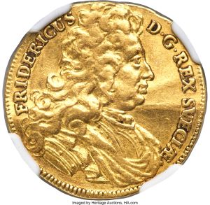 "Sweden: Frederick I gold Ducat 1723 AU Details (Bent) NGC, Stockholm mint, Variety without GZ initials. Georg Zedritz as mintmaster. A coin whose exceptional rarity far outstrips any minor flaws with its conditional preservation, coming as one of only two known examples of the date lacking the mintmaster's initials below the reverse monogram, with the other specimen permanently held in the Royal Coin Cabinet in Stockholm. Boasting an incredible provenance that would make most Swedish coins blush, the coin at hand was reportedly the second of two pieces preserved in the famous collection of Sven Svensson, both donated to the Royal Swedish Collection, with that institution deciding to hold onto the nicer representative and consign the other to auction. Just mildly circulated across the devices, the offering preserves a distinctive shimmer to the surfaces, any time spent in commerce keeping from obscuring the coin's finer features, while the aid of magnification even discloses trace amounts of die polish along the protected regions of the king's portrait. Certainly a special opportunity for all Swedish collectors, and the first opportunity to procure the one privately held example in over a decade. Ex. Julius Hagander Collection, Part II (Künker Auction 196, September 2011, Lot 5103); Karl-Erik Schmitz Collection, Part II (Schweizerischer Bankverein-Spink Zürich 1990, Lot 1202); Sven Svensson Collection (AB Hirsch Myntauktioner Auction 1, October 1966, Lot 469). From the Long Island Collection."