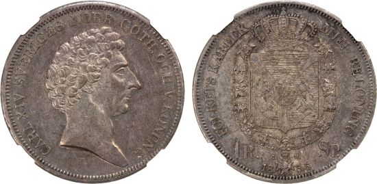 This specimen was lot 1410 in Stephen Album sale 43 (Santa Rosa, CA, May 2022), where it did not sell. The catalog description[1] noted, "SWEDEN: Carl XIV Johan, 1818-1844, AR riksdaler specie, 1836, mintmaster CB, much original mint luster! NGC graded AU55." This type was struck 1831-42 and most of the dates are scarce to rare. This one is fairly common. Carl XIV Johan was originally Charles Bernadotte, one of Napoleon's generals. He married into the Swedish royal family and became king himself in 1818. The present dynasty is descended from him.