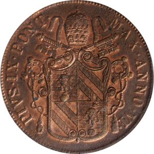 * [[Papal States 1850-R 5 baiocchi KM-1356|1850-R bronze 5 baiocchi]] | * [[Papal States 1850-R 5 baiocchi KM-1356|1850-R bronze 5 baiocchi]] | ||