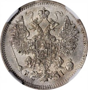 This specimen was lot 24523 in Stack's Bowers NYINC sale (Newport Beach, CA, January 2021), where it sold for $144. The catalog description[1] noted, "RUSSIA. 15 Kopeks, 1870-CNB HI. St. Petersburg Mint. Nicholas II. NGC MS-63. A decently struck coin with satiny luster and largely free of toning." This type was struck 1867-1914 in large numbers and this is a common date. In 1867, the weight was reduced from 3.11 g, 0.750 fine silver to 2.70 g, 0.500 fine silver and struck in that form until the collapse of the regime.