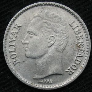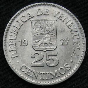 Shown is a 1977 25 centimos, minted in Werdohl (Germany). The obverse features the portrait of Simon Bolivar, recognized as liberator of the Venezuelans from rule by the Spanish. The portrait was designed by Albert Barre in Paris. The reverse features the coat of arms, denomination, and date.