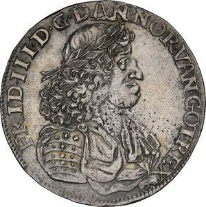 This specimen was lot 10241 in Stack's Bowers Collectors Choice Online Auction (Costa Mesa, CA, February 2025), where it sold for €432 (about US$450). The catalog description[1] noted, "DENMARK. Krone, 1666. Copenhagen Mint. Frederik III. NGC AU Details--Cleaned. From the L. E. Bruun Collection." This type is noted for 1666 and is one of several kroner (Dav-3579 (shown here), -3579A, Dav-3580, -3580A, Dav-3581, -3581A and Dav-3582) issued that year. None are common. A krone was four mark or two-thirds speciedaler.