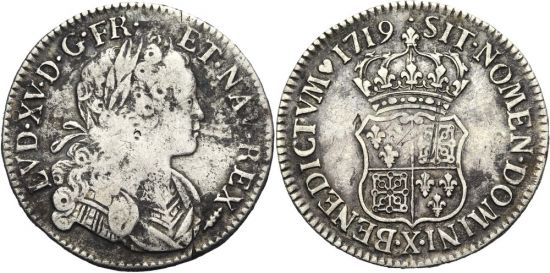 "FRANCE, Royaume, Louis XV (1715-1774), AR écu de Navarre, 1719X, Amiens. D/ B. enfantin à d., l., dr. et cuir. R/ Ecu écartelé de France-Navarre, échancré et couronné. Taches. Beau à Très Beau. (kingdom of France, Louis XV (1715-74), silver écu of Navarre of 1719, Amiens mint. Obverse: draped, cuirassed and laureate infant bust to right; reverse: crowned and quartered arms of France and Navarre. Stained, fine to very fine.)"