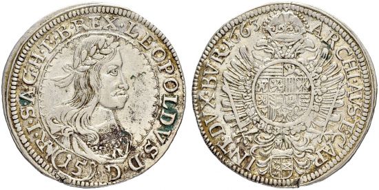This type was struck 1663-64 and 1675 at the St. Veit mint for emperor Leopold. It is priced about double that of similar issues from Hall and Graz.