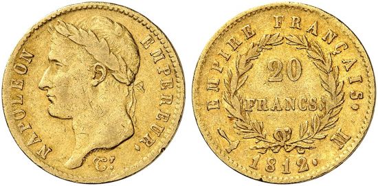 "I. Kaiserreich. Napoleon I. 1804-1815. 20 Francs 1812 M, Toulouse. Sehr selten. Nur 6498 Exemplare geprägt. Gutes sehr schön. (France, first empire, Napoleon I, 1804-15, twenty francs of 1812, Toulouse mint. Very rare. Only 6498 pieces struck, Good very fine.)"