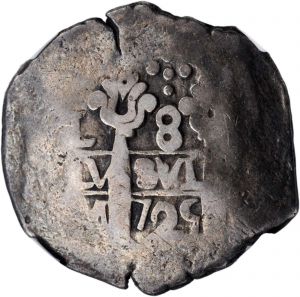 This specimen was lot 41250 in Stack's Bowers ANA sale (Costa Mesa, CA, August 2021), where it sold for $960. The catalog description[1] noted, "PERU. Cob 8 Reales, 1725-L M. Lima Mint. Luis I. NGC FINE-12. Struck during the short-lived reign of Luis I, this survivor is far better than most seen, displaying a clear date and astonishingly original surfaces. RARE in problem-free quality, this piece carries a valuation of $1,500 in Very Good, $3,000 in Fine, and $5,000 in Very Fine condition in the Standard Catalog of World Coins." Cob eight reales were struck at the Lima mint 1701-46 for Philip V of Spain and became the "pieces of eight" of pirate lore. Specimens with legible dates bring triple those without. The fineness was lowered from 0.931 to 0.917 in 1728.