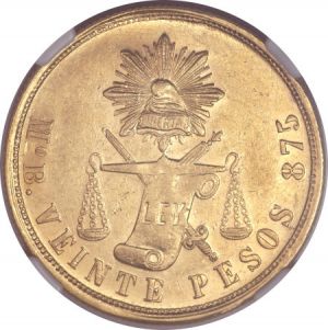 This specimen was lot 31343 in Heritage sale 3035 (Long Beach, September 2014), where it sold for $1,762.50. The catalog description[1] noted, "Republic gold 20 Pesos 1874/2 Mo-B AU58 NGC, Mexico City mint. An attractive example for the designation, with much mint bloom and appealing surface quality. Much above average for the type and very popular in this quality. From The FoxLair Collection." This type was struck in Mexico City 1870-1905 and is the most available mint. Assayer M also exists for this date. All known specimens are overdated.