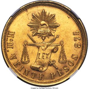 This specimen was lot 33965 in Heritage sale 3106 (New York, January 2023), where it sold for $4,200. The catalog description[1] noted, "Mexico: Republic gold 20 Pesos 1878 Mo-M MS62 NGC, Mexico City mint. A scarce date of this popular type, with only one known at NGC in a higher state of preservation. Admitting only a few flaws even to the scrupulous eye, an appealing amber tone amplifies the aesthetic caliber of the piece." The Mexico City mint was the largest producer of gold twenty pesos, striking them 1870-1905.