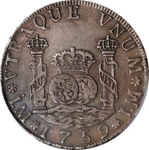 This specimen was lot 72072 in Stack's Bowers Collectors Choice sale (Costa Mesa, CA, November 2022), where it sold for $1,020. The catalog description[1] noted, "PERU. 4 Reales, 1759-LM. Lima Mint; Assayers Joseph Rodriguez de Carrasa & Manuel de Iglesia Abarca (J M). Ferdinand VI. PCGS Genuine--Repaired, EF Details. This 4 Reales piece exhibits some smoothing in the fields that accounts for its designation. This deeply toned cob is otherwise quite wholesome and attractive, with sharp details and some alluring luster. From the Pat Johnson Collection." This type was struck 1752-1760 for king Ferdinand VI. As a class, pillar coinage of Peru is much less plentiful than that of Mexico, though it is more available than the remaining mints.