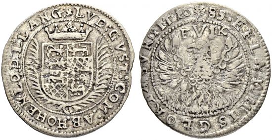 "DEUTSCHLAND | Hohenlohe-Waldenburg, Grafschaft. Ludwig Gottfried, 1685-1728. 1/8 Taler 1685, Schillingsfürst. Sehr selten. Sehr schön. (Germany, county of Hohenlohe-Waldenburg, Louis Gottfried, 1685-1728, one-eighth thaler of 1685, Schillingsfurst mint. Very rare, Very fine.)"