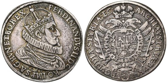 "SAINT EMPIRE, Ferdinand II (1619-1637), AR Taler, 1620, Graz. Pour la Styrie. D/ B. couronné et cuirassé à d., le col fraisé. R/ Aigle impériale éployée, un grand écu ovale sur la poitrine. Patine foncée. Très Beau. (Holy Roman Empire, Ferdinand II, 1619-37, silver thaler of 1620, Graz mint, struck for Styria. Obverse: crowned and armored bust right with ruffed collar; reverse: crowned imperial eagle with large oval arms on its breast. Nice patina, Very Fine.)"