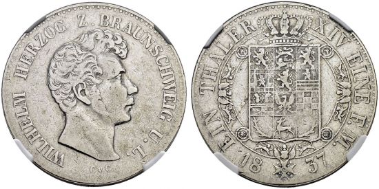"Braunschweig--Wolfenbüttel, Herzogtum, Wilhelm, 1831-1884 Taler 1837. Braunschweig. Selten. Nur 2788 Exemplare geprägt. Fast sehr schön. (Germany, duchy of Brunswick-Wolfenbuttel, William, 1831-84, thaler of 1837, Brunswick mint. Rare. Only 2788 pieces struck, About very fine. NGC VF Details.)"