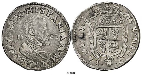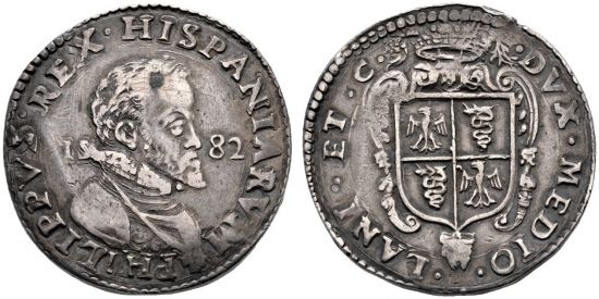 The second specimen was lot 2959 in Sincona sale 20 (Zürich, October 2014), where it did not sell. The catalog description[2] noted, "Scudo 1582. Sehr schön. (very fine.)" Ducatons were issued in the Spanish Netherlands and associated states (including the bishopric of Liège and Franche Comte) during the sixteenth and seventeenth centuries, where they competed with French écus, German talers and Dutch daalders and ducatons. The type shown here was struck at Milan 1579-88 for Philip II of Spain. The series is plagued by bad planchets and poor strikes, reducing their appeal to collectors. The Spanish issues for Milan ended with the death of Charles II in 1700, when the duchy passed to Austria, which held it until the coming of Napoleon.