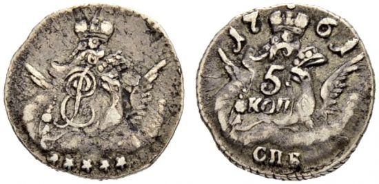 − | This specimen was lot 1754 in Sincona sale 63 ( | + | This specimen was lot 1754 in Sincona sale 63 (Zürich, June 2020), where it sold for 100 CHF (about US$125 including buyer's fees). The catalog description<sup>[1]</sup> noted, "RUSSIA | [[Russia]]n Empire and Federation | Elizabeth, 1741-1761. 5 Kopecks 1761, St. Petersburg Mint, SPB. Rare. Very fine." This type was struck 1756-61 for the empress Elizabeth. The next silver five kopeks would not be issued until 1797, after the death of Catherine the Great. In the intervening years, large quantities of copper five kopeks were struck at numerous mints. |
